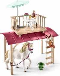 Nakladi konja v karavan in se odpravi na pustolovščino! Figurice in dodatki iz kolekcije Konjeniški klub so dodelani do najmanjše podrobnosti ter ti približajo življenje v hlevu in okoli njega. Potopi se v svet konjereje, zberi figurice in si ustvari lastno jahalno konjušnico. Karavan ima odpirajoča se okna in ga je mogoče razstaviti na več delov. Terasa lahko stoji poleg bivalnega vozila ali na njegovi strehi. Streho je mogoče povsem odstraniti in jo uporabiti kot senco za konje. Pakiranje vsebuje: karavan s teraso, figurico konja, figurico jahačice in celo vrsto dodelanih dodatkov, med katerimi so na primer kavč, dežnik, vrtno pohištvo in drugi. Dimenzije razstavljenega karavana so 23 x 12,5 x 19 cm. Karavan se lahko priključi na Schleich pick-up. Pick-up ni del pakiranja. Schleich so realistične in do podrobnosti dodelane figurice, kjer oblikovalci stavijo na filozofijo telesa, strukturo mišic in celoten izraz figurice. Otroci lahko igrajo z živalmi z vseh koncev sveta, pradavnih dinozavrov, filmskih in pravljičnih junakov, ki so zvesta kopija svojih izvirnikov, in čarobnih vilinov in vil iz magičnega sveta Bayala. Primerno za otroke od 5 let.