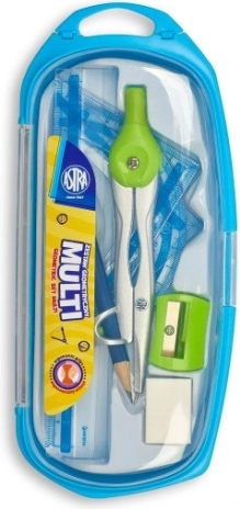 Popolna šolska oprema za natančno risanje v praktičnem etuiju. Ta 8-delni geometrijski komplet znamke ASTRA vsebuje vse, kar učenci potrebujejo za matematiko in tehnično risanje: kovinski šestilo, ravnilo, trikotnike, kotomer, svinčnik, šilček in radirko.
