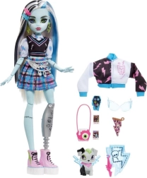 Frankie Stein je pripravljena zasijati po šolskih hodnikih z edinstvenim videzom. Njena obleka vključuje stilsko karirasto krilo, bluzo z motivom strel in kamizolko, dopolnjeno s platform čevlji in drugimi dodatki, kot so očala in uhani v obliki strel.
