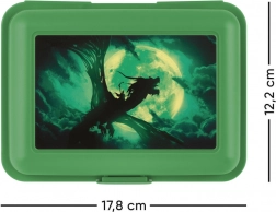 Ta praktična škatla za malico je idealna rešitev za vsakodnevno shranjevanje vaših priljubljenih jedi. S stilskim dizajnom zmaja, ki leti proti polni luni, ne samo, da ohrani vašo hrano svežo, ampak tudi izstopa z izvirnim videzom. Enostavno zapiranje z enim zaklepom in notranji delilni predelki pomenijo, da vsak kos hrane ostane na svojem mestu.