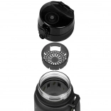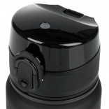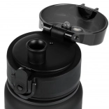 Praktičen flip pokrovček z varovalom preprečuje nenamerno odpiranje v nahrbtniku in zagotavlja udobno pitje z eno roko. Priloženo je odstranljivo cedilo za sadne napitke ali čaj; material je primeren tudi za tople napitke. Vgrajen pašček olajša prenašanje, zato je steklenica odlična za šolo, trening in na poti.