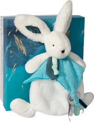 Ta darilni set znamke Doudou prinaša mehkega plišastega zajčka z ninico, ki bo razveselil dojenčka in starše. Slogovna izvedba z nežnimi trakovi in moderno modro barvo ga naredi za čudovit okras otroške sobice in priljubljeno igračo za crkljanje.