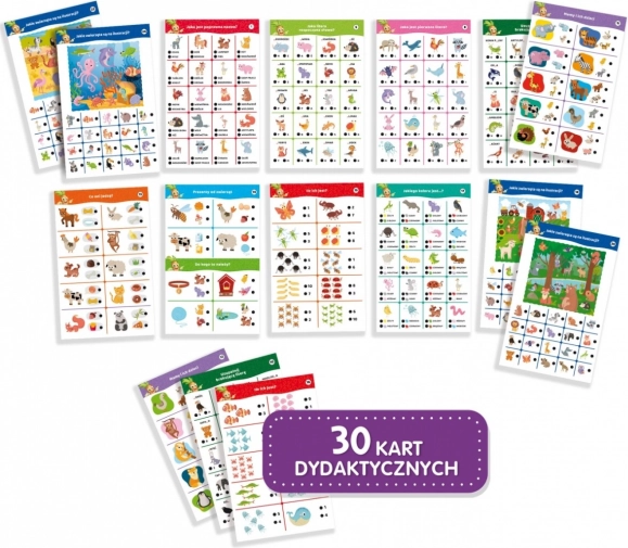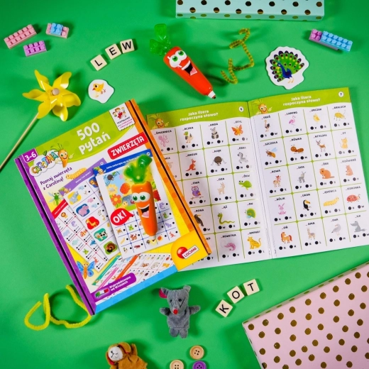 Karotina 500 vprašanj bo vašemu otroku pomagala spoznati najrazličnejše živali s pomočjo 30 interaktivnih izobraževalnih kart. Preprosto uporabite govorečo in svetlečo Carotino ter odgovorite na vprašanja tako, da s konico pisala pritisnete na črne pike, dodeljene odgovorom. Vaš otrok lahko igra tudi igro Išči in najdi, tako da na ilustracijah poišče živalice. Zabavajte se!
