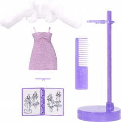 Punčka navduši z gostimi, valovitimi lasmi, primernimi za česanje, bleščečo obleko, mehko belo »krzneno« jaknico in vijoličnimi čevlji z visoko peto. V pakiranju najdete tudi glavnik, stojalo in majhen ilustriran zvezek za navdih pri ustvarjanju zgodb in modnih skic.