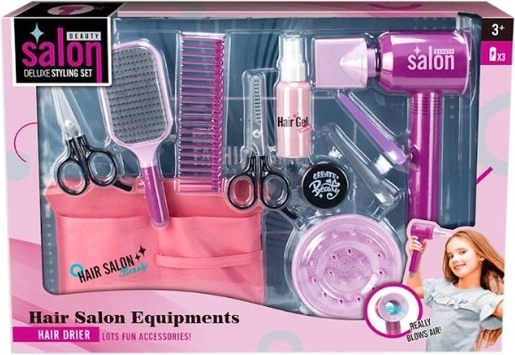 Set je zasnovan za otroke od 3. leta starosti in jim pomaga razvijati ustvarjalnost ter fine motorične spretnosti. Sušilnik za lase deluje na baterije in potrebuje 3xAAA baterije (niso priložene).