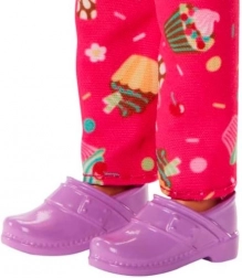 Lutka Barbie je oblečena v belo kuharsko jakno z rožnatimi detajli in kuharsko kapo, ki ji pomaga pri vlogi slaščičarke.