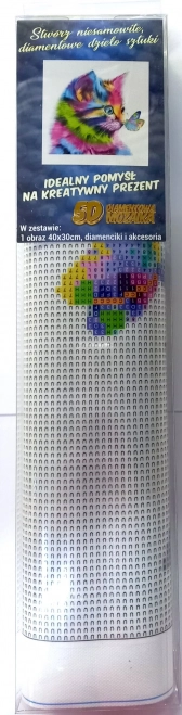 Ta ustvarjalni komplet za diamantno slikanje ponuja odlično kombinacijo počinka in zabave za vso družino. Postopno lepljenje bleščečih kamenčkov ustvarja podrobno mozaiko z nežnim leskom, ki bo krasila vaš dom. Motiv mucka z metuljem bo navdušil ljubitelje živali in vse, ki iščejo pomirjujočo ustvarjalno dejavnost.