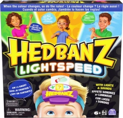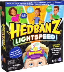 Uživajte v vznemirljivi igri Hedbanz Lightspeed, kjer se pravila nenehno spreminjajo zaradi dinamične elektronske čelade s tremi barvami. Predstavljajte si prizor, odgovorite s svetlobno hitrostjo ali uporabite tri namige glede na barvo, ki jo čelada trenutno prikazuje.