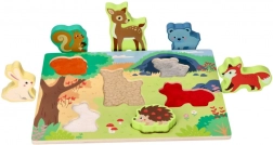 Ta kakovostna lesena vstavljanka z motivom gozdnih živali je zasnovana tako, da malčke pritegne z barvami in oblikami ter jih varno spremlja pri prvih korakih odkrivanja. Debelejši 3D koščki dobro ležijo v roki in se zlahka vstavljajo v izreze na podlagi.