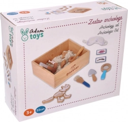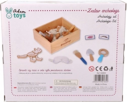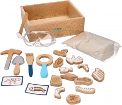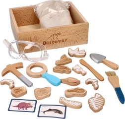 V paketu je vse, kar mali paleontolog potrebuje: od skrinjice raziskovalca do orodij (kladivce, lupa, nožek, čopič, lopatka) ter kosti dinozavrov, ribe in fosilov. Dve dvostranski kartici pomagata zlahka prepoznati izkopane najdbe. Pesek je proizveden v EU in izpolnjuje varnostne standarde.