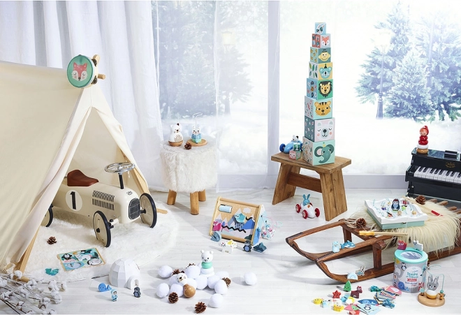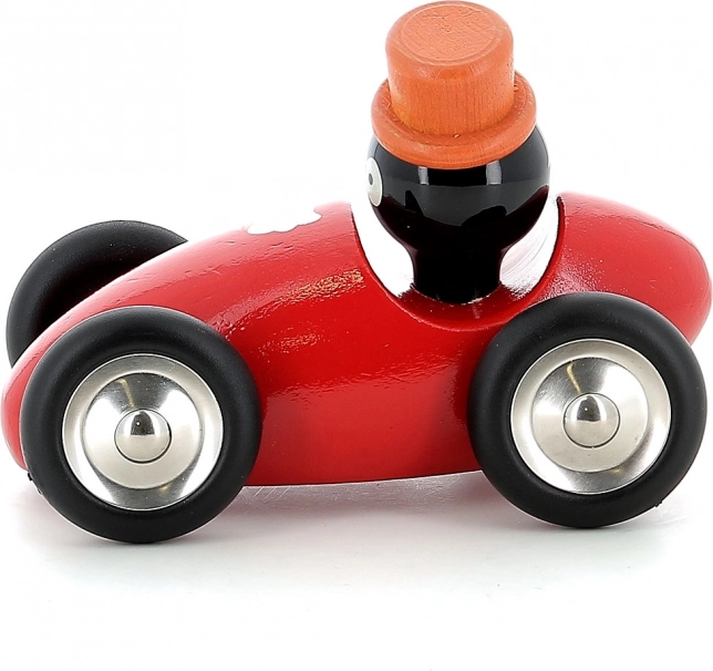 Odkrijte čar klasičnih lesenih igrač z modernim pridihom. Dirkalni avtomobilček s pingvinom Renéjem je izdelan v Franciji, v delavnici Jura, in lakiran z edinstveno tehnologijo potapljanja v lakirano kopel. Gladka površina, žive barve in čvrsta konstrukcija ga naredijo priljubljenega spremljevalca za prve vožnje in domišljijske dirke.