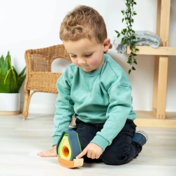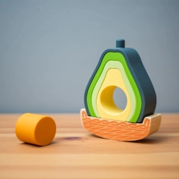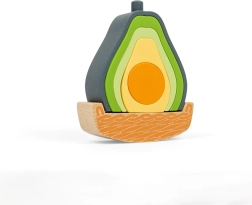 Igralni set v obliki avokada združuje les s silikonom za stik z živili za varno in zabavno učenje. Otroci lahko dele zlagajo, razvrščajo in pustijo, da se avokado ziblje na leseni osnovi. Pet silikonskih delov je mehkih, trpežnih in odlično služijo kot senzorična igrača. Materiali so netoksični, silikon je mogoče pomivati v pomivalnem stroju, leseni deli pa imajo certifikat FSC.