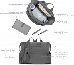 Premišljena razporeditev omogoča hiter dostop do vseh nujnih stvari za dojenčka in starše. Univerzalne zaponke omogočajo enostavno pritrditev na voziček, pomožni trakovi pa prilagoditev velikosti tako, da se nahrbtnik prilega tudi pod sedež v letalu.