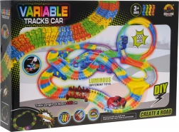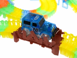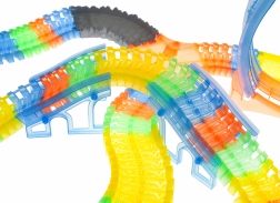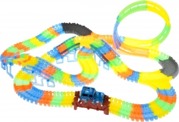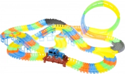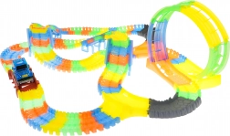 Svetleča proga z zanko in avtomobilčkom v kompletu je primerna za otroke od 3. leta dalje. Proge so fleksibilne, lahko jih razporedite v poljubnih kombinacijah, obračate, dvigate, preurejate – tudi med vožnjo avtomobilčka. Proge so fluorescenčne in v temi svetijo. Vozilo, ki je del kompleta, ima LED osvetlitev, vožnja v temi ustvarja odličen učinek. Vozilo napajata 2 bateriji AA 1,5 V, bateriji nista priloženi. Za zagon avtomobilčka pritisnite gumb na strehi. Skupna dolžina proge je 446 cm.