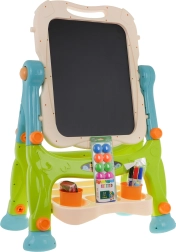 Ta ustvarjalni komplet združuje magnetno belo tablo za pisanje z markerji in pritrjevanje magnetov s črno kredno površino za klasično risanje. Tabla se vrti za 360°, ima zaobljene robove za varno uporabo in jo zahvaljujoč zamenljivim daljšim in krajšim nogam zlahka prilagodite trenutni otrokovi višini. Praktična polica ohranja vse potrebščine pri roki, vgrajene sponke pa omogočajo slikanje tudi na papir.