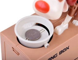 V skledico pred psom vržete kovanec. Pes se začne premikati, kot da bi jedel hrano iz sklede, kar povzroči, da kovanec pade v hranilnik. Pri tem se pes veselo premika in stresa z ušesi. Za delovanje potrebujete 3 baterije. Hranilnik otrokom pomaga razumeti, da je varčevanje ne le zabavno, ampak prinaša tudi pozitivne rezultate.