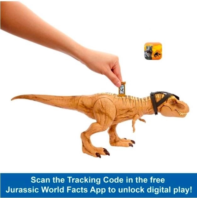 Po pritisku na gumb T‑Rex odpre gobec in obrne glavo v stran, kar verno posnema filmske prizore iz Jurassic World. S skeniranjem skrite DNA oznake v aplikaciji Jurassic World Facts odklenete razširjene informacije in igralne izzive.