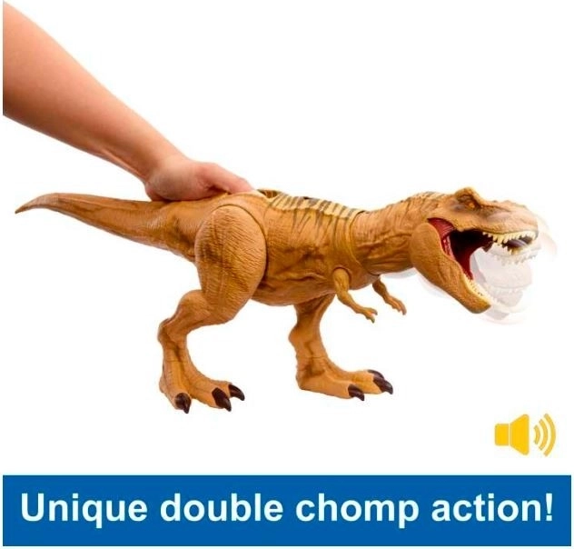 S pritiskom na gumb T‑Rex odpre gobec in obrne glavo v stran, kar spremlja realističen dinozavrski rjovec, navdihnjen s filmi Jurassic World.