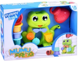 Prisrčna kopalna žabica prinaša otrokom ob kopanju veliko zabave. Vlivajte vodo v žabjo glavo in opazujte kaskado vrtečih se bobnov, ki ustvarja vesele vodne učinke. Priloženi so 4 barviti zložljivi lončki za vlivanje, razvrščanje in sestavljanje, ki spodbujajo fino motoriko, koordinacijo in ustvarjalnost.
