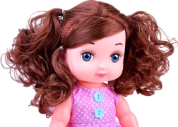 Lutka ima dolge kodraste lase in živo modre oči s trepalnicami, ki ji dajejo realističen in živ izraz.