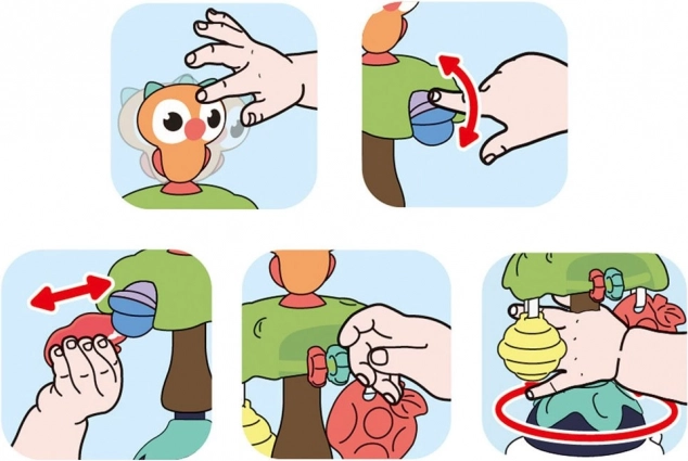 Barvni in gibljivi deli igrače spodbujajo senzorični in motorični razvoj otrok.