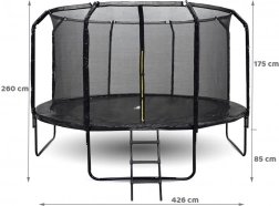 Robusten trampolin SkyFlyer s premerom 426 cm (14 ft) ponuja velikodušen prostor za skakanje, kondicijske vaje in prosti čas. Za varnost skrbi visoka varnostna mreža, napeta s pomočjo zgornjega obroča, ter mehko oblazinjeni profilirani stebri. Vstop je zavarovan z zadrgo in zaponko za maksimalno varnost otrok.
