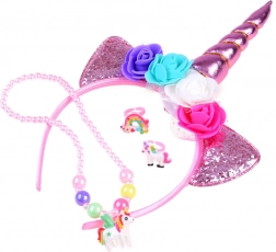 Ljubka set za male modne navdušenke vsebuje samorogov obroč za lase, barvno ogrlico in dva prstana. Obroč ima mehak, bleščeč rog, satenski premaz za udobje in cvetlične okraske. Odličen za pustovanje, rojstnodnevne zabave in vsakodnevno igro vile ali princeske. Udobno nošenje, bleščeči detajli in čaroben samorogov dizajn poživijo vsak kostum.