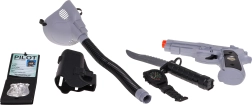 Set vsebuje masko z dihalno cevjo, igračo pištolo, nož in druge realistične dodatke za avanturistične igre.