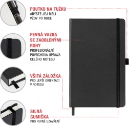 Elastični trak zvezek varno drži zaprt, zanka za pero pa poskrbi, da lahko pišete kjerkoli in kadarkoli. Kompaktne mere 13 × 21 cm olajšajo prenašanje.