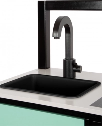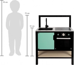Za maksimalno igralno izkušnjo ne manjkajo vodovodna pipa z ročico za uravnavanje “temperature”, odstranljivo plastično korito za “pomivanje posode” in pečica z odstranljivim pekačem. Dno police je mogoče uporabiti kot rešetko za žar. Omara pod delovno površino in kljukice za pripomočke poskrbijo za red, pri čemer je levi del omarice mogoče igrivo spremeniti v “hladilnik” ali “pomivalni stroj”.