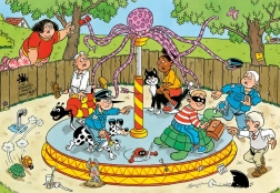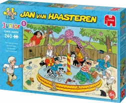 Odkrijte svet igrivih ilustracij Jana van Haasterena v otroški ediciji Junior. Ta vesela scena iz okolja vrtiljaka je polna drobnih šal in tipičnih motivov avtorja – od morskih psovih plavuti do nepričakovanih likov v množici. Zaradi večjih in enostavno oprijemljivih koščkov je sestavljanje dostopno tudi mlajšim otrokom.