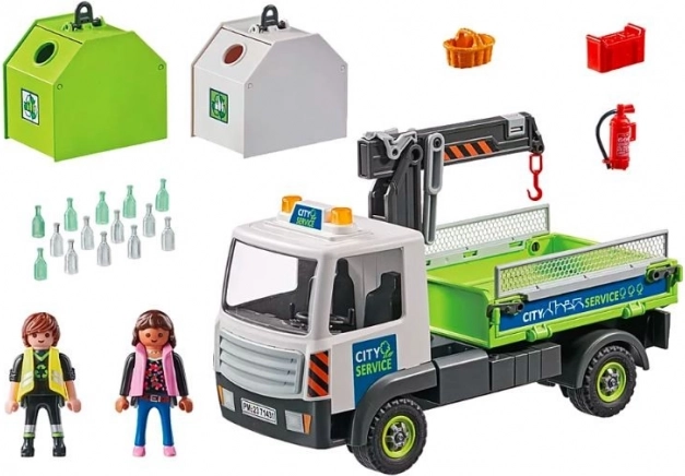 Velik žerjav brez težav dvigne kontejner s steklenicami in ga naloži na prikolico tovornjaka. Zaradi mnogih realističnih podrobnosti in funkcij te komplete iz serije PLAYMOBIL City Life Pomoč pri čiščenju mesta, spodbujajo otroke od 4 let dalje k učenju o varovanju okolja z igro.