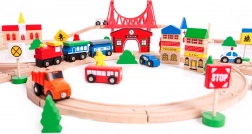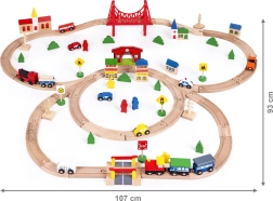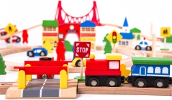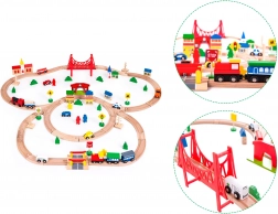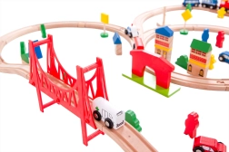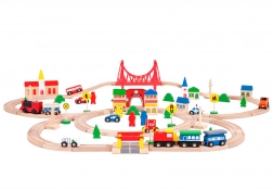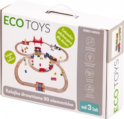 Komplet lesene baterijske železniške proge z 90 deli blagovne znamke Ecotoys ponuja ure zabave in razvoj motoričnih sposobnosti. Vsebuje barvni vlak z vagoni, most, prometne znake in hiše.