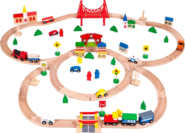 Komplet železniške proge vključuje raznolike elemente, kot so vozila, prometni znaki in stavbe, ki spodbujajo k ustvarjalni igri.