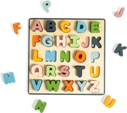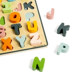 Lesena sestavljanka s 26 pisano obarvanimi črkami je popolno orodje za prvo spoznavanje z abecedo. Vsaka črka ima svoj izrez v ustrezni barvi, kar otrokom olajša pomnjenje in pravilno razvrščanje. Zahvaljujoč čvrstim in enostavno oprijemljivim koščkom otroci vadijo koordinacijo oko–roka in zbranost.