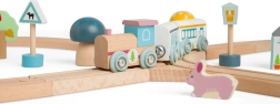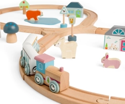 Ta lesena vlakovna proga ob gozdu mladim raziskovalcem ponuja neskončne možnosti za kreativno igro. Proga v obliki osmice vodi mimo očarljivih mušnic, borovcev in gozdnih živali, pa tudi mimo kavarne ali pekarne. Kakovostna izdelava in robustna zasnova zagotavljata, da bo igrača dolgo obstojna in bo otrokom prinesla veliko veselja.