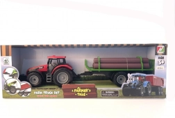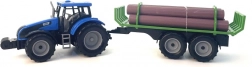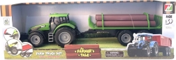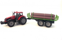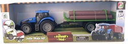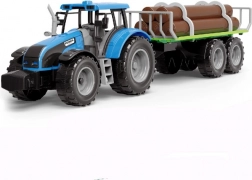 Priklopnik natovorjen s hlodi in različne barve traktorja veščajo zabavo pri igranju na kmetijskih in gradbenih scenarijih.