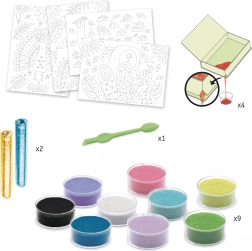Set vsebuje: 4 slike, 1 lopatico, 9 lončkov z barvnim peskom in 2 tubici bleščečih bleščic.