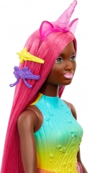 Ta čarobna punčka Barbie je navdihnjena s svetom domišljije in otrokom prinaša ure ustvarjalne zabave. Zahvaljujoč izjemno dolgim lasem v odtenkih magente in vijolične lahko mali stilisti lase česajo, krasijo in ponovno oblikujejo pričeske glede na razpoloženje. Priloženi so naglavni trak z rogom samoroga, sponke, okrasni glavnički in krtača za lase.