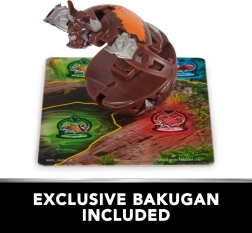 Rjav Bakugan s srebrnimi detajli se ob prehodu preko vratne karte odpre v bojno obliko – ikonična transformacija kot v seriji.