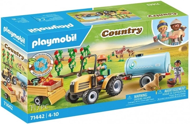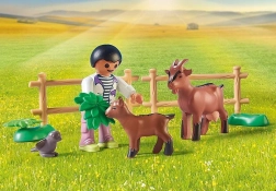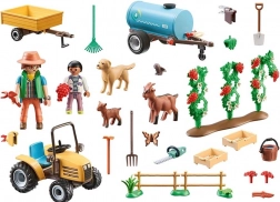 Komplet vsebuje: dve figurici Playmobil, psa, dve kozi, traktor s prikolico, cisterno za vodo ter številne druge dodatke, ki prinašajo več realizma zgodbam.