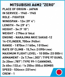 Mitsubishi A6M2 Zero je lahko prepoznavno japonsko lovsko letalo iz druge svetovne vojne, ki se je proslavilo z udeležbo v ključnih bitkah, kot sta napad na Pearl Harbor in bitka pri Midwayu. Set vsebuje 170 visokokakovostnih kock, ki vam omogočajo zgraditi podroben model tega legendarnega letala z odstranljivim pristajalnim podvozjem.