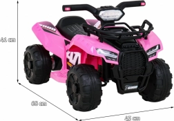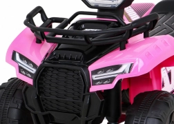 Stajliš otroški štirikolesnik Quad Storm ponuja varno zabavo doma in na prostem. Ima električni pogon 25 W, baterijo 6 V/4,5 Ah, sprednje LED luči in avdio ploščo z MP3/USB in AUX. Enostavno upravljanje z gumbom za plin na krmilu ter stabilna plastična kolesa za gladko vožnjo.