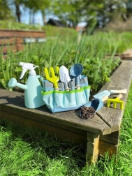 Šest robustnih orodij (lopatke, lopata, zajemalka, grabljice in vile) z lesenimi ročaji je zasnovanih za male vrtnarje.