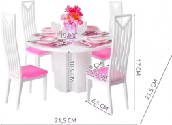 Stilski jedilni set za hiško za punčke vključuje okroglo mizo s 4 stoli, celoten jedilni servis in pribor, 8 kozarcev ter vazo s cvetjem. Spodbuja kreativno igro, razvoj socialnih veščin in je zaradi hitre montaže idealen tudi za na pot. Primerno za punčke do 29 cm.