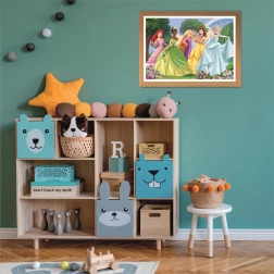 Barvita scena s priljubljenimi princesami prinaša otrokom veselje pri sestavljanju in jih spodbuja, da sliko uspešno dokončajo.