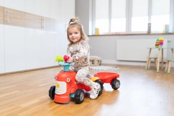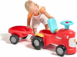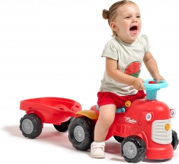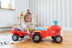 Ta rdeč otroški poganjalec v obliki traktorja z odstranljivo prikolico je idealno prvo vozilo za malčke. Zahvaljujoč stabilni konstrukciji in največji nosilnosti 25 kg je vožnja varna in udobna. Vrtljiva sprednja prema olajša zavijanje, medtem ko hupa na krmilu doda še več zabave pri vsaki vožnji.