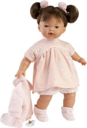 Realistična punčka Llorens Vera bo razveselila vsakega otroka s svojo govorečo in jokajočo funkcijo, mehkobo tekstilnega telesa ter podrobno izdelanimi lasmi. Ko odstranite magnetno dudo, izgovori »mama«, »papa« in odda realističen zvok joka; z dudo se takoj pomiri. 33 cm visoka punčka je ročno izdelana v Španiji in priložena v darilni škatli.