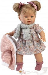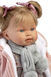 Punčka je oblečena v usklajen komplet s plaščkom, šalom in dudo na sponki. Možen je nakup originalnih oblačil Llorens za velikost 42 cm.