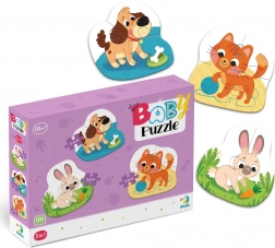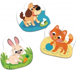 Ta set obrisnih puzzlov je idealen za prve korake v sestavljanju. Vsak motiv ima različno število kosov, zato se otrok naravno uči napredovati od enostavnejših do zahtevnejših sestavljank. Vesele ilustracije hišnih ljubljenčkov spodbujajo radovednost in podaljšujejo čas koncentracije.